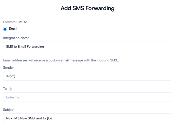 | Integration Name | A label to identify the forwarding rule. Useful for managing multiple SMS→Email routes. |