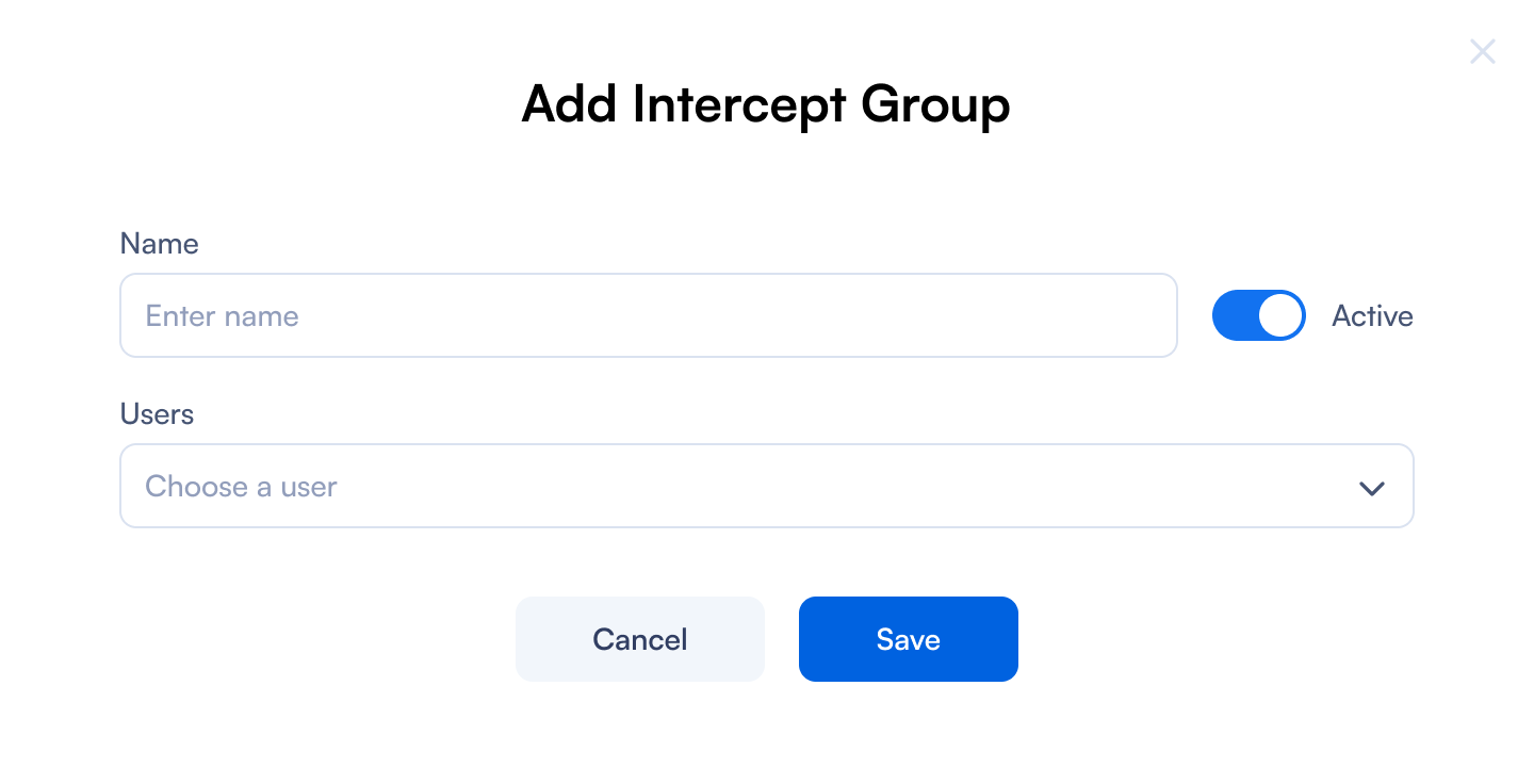| Active toggle | Use the toggle to activate or deactivate the intercept group. |