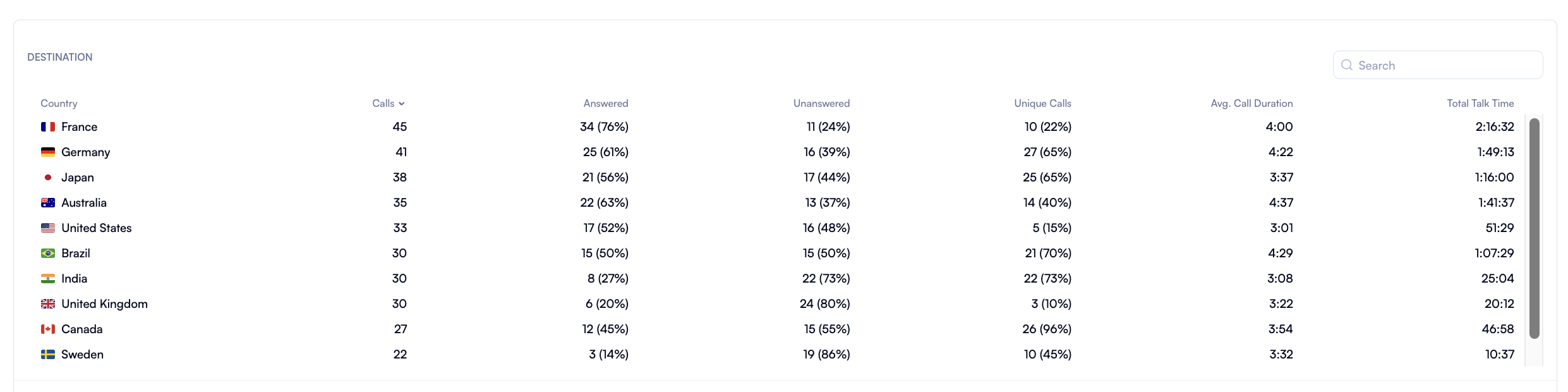 | Calls | Total number of calls made to each country. Provides an overview of call volume per destination. |