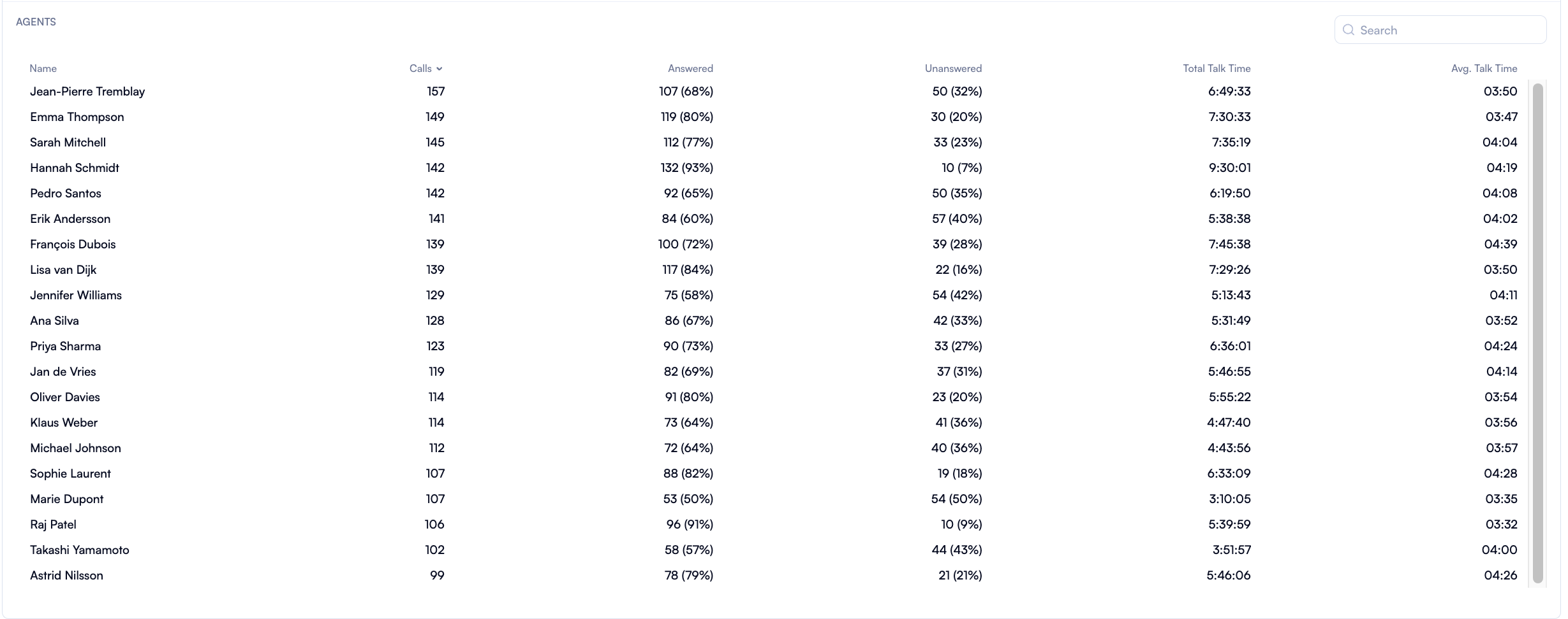 | Answered | Number and percentage of calls that each agent successfully answered. A higher percentage reflects better responsiveness for that agent. |