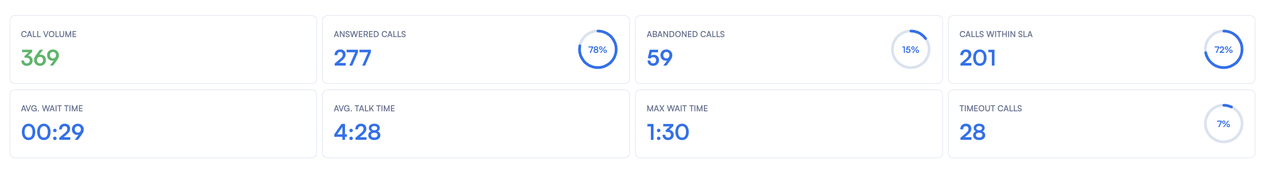 | Abandoned Calls | Total number of calls that were abandoned by the caller, displayed with percentage. |
