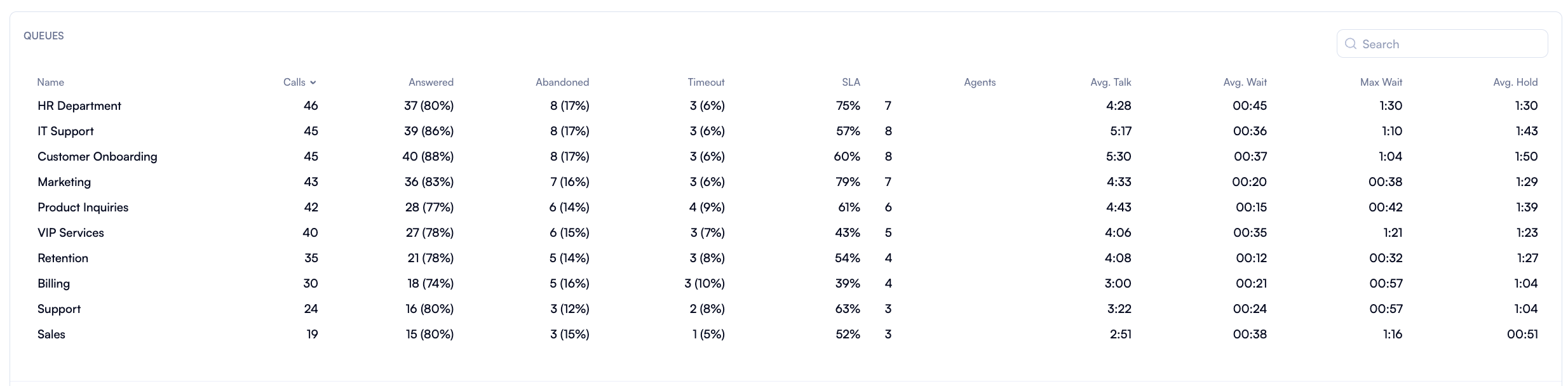 | Avg. Hold | Average hold time experienced by callers in each queue. |