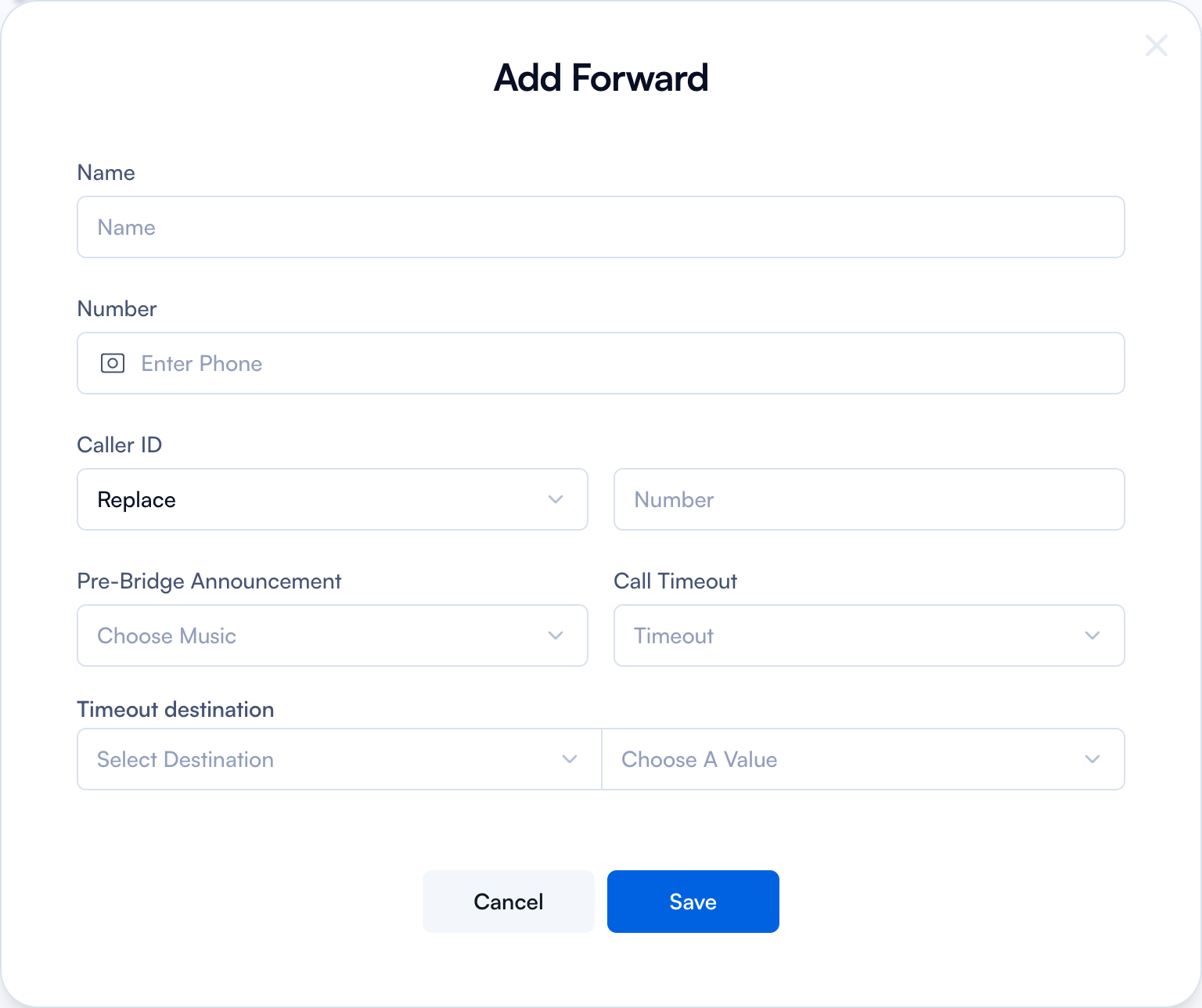 | Timeout destination | What happens if the forwarded call is not answered in the specified time. | Choose a destination: User, Time Condition, Endpoint, Queue, Announcement, Forward, IVR, Voicemail, Ring Group, or Conference. You can also assign a Value from the dropdown on the right. |