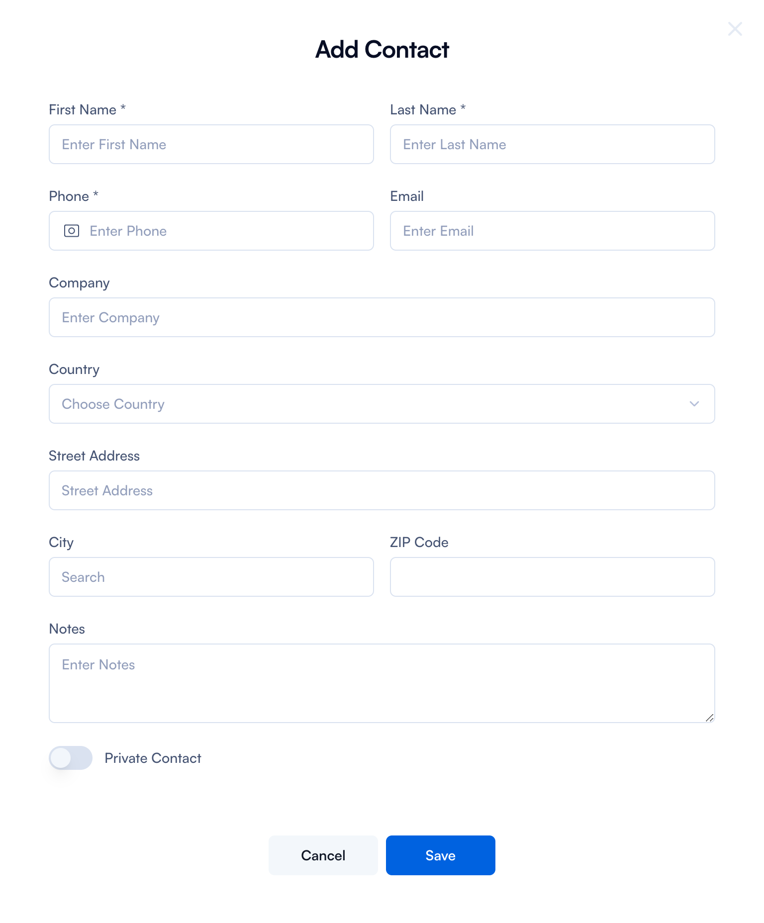 | Private toggle | Toggle this option on (blue) if you want the contact to be private. Leave it off (gray) if the contact does not need to be private. |